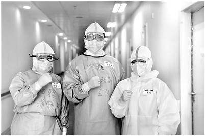 圖為湘雅醫(yī)院第七黨總支紀(jì)檢委員錢招昕(中)和援鄂醫(yī)療隊在武漢協(xié)和醫(yī)院西院區(qū)重癥病房內(nèi)相互鼓勵。
