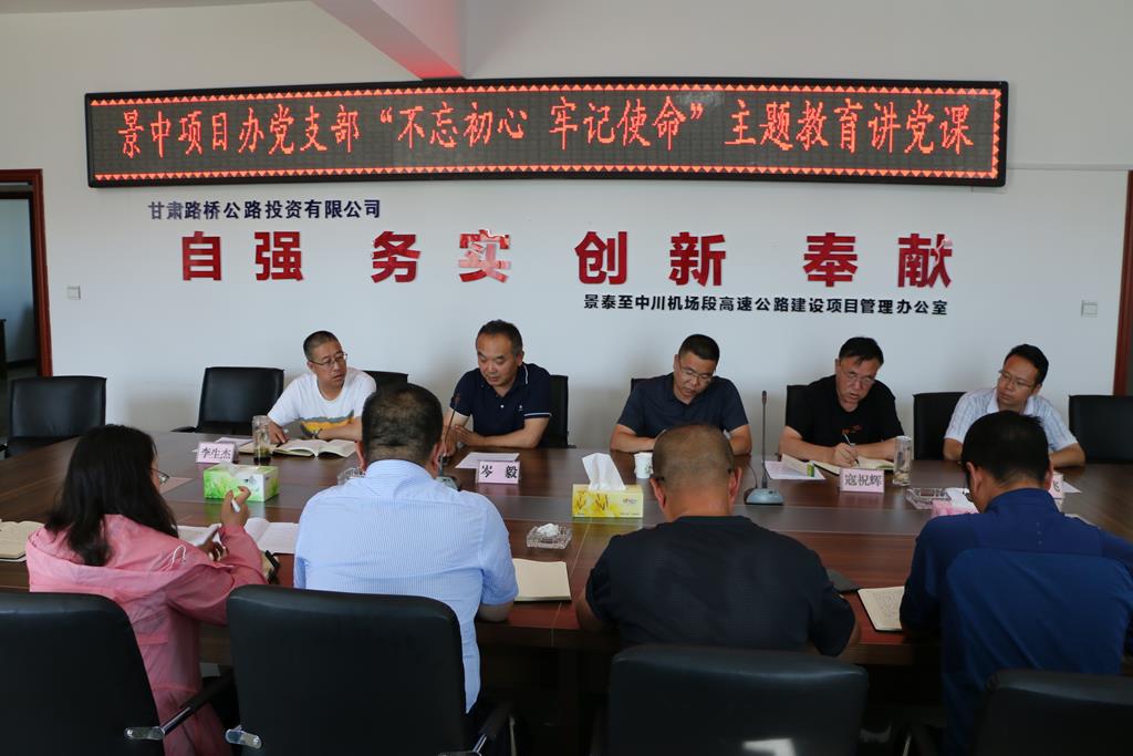 按照公司黨委“不忘初心、牢記使命”主題教育安排,7月25日下午,甘肅路橋公路投資有限公司監(jiān)事會(huì)主席在景中項(xiàng)目辦作了題為“不忘初心、牢記使命,立足崗位、擔(dān)當(dāng)作為”的專(zhuān)題教育黨課,項(xiàng)目辦全體人員參加了學(xué)習(xí)會(huì)議。