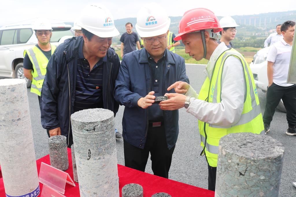 王曉鐘董事長一行深入施工現(xiàn)場,對三個項目的路基路面進(jìn)行了實地查看,詳細(xì)了解了項目施工創(chuàng)新以及品質(zhì)工程示范創(chuàng)建工作,聽取了項目建設(shè)進(jìn)展、質(zhì)量、安全、管理等方面的工作匯報。